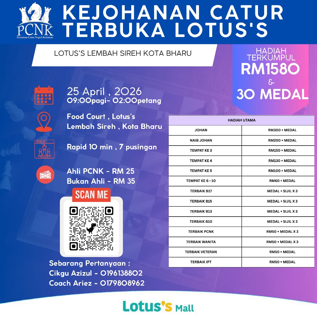 Memandangkan setiap Teknik Catur daerah akan mengadakan kejohanan MSSD masing-masing sepanjang bulan April ni, PCNK mengadakan inisiatif mengadakan satu kejohanan untuk pemain lebih dewasa selepas MSSK tamat nanti. Kejohanan bulanan Bawah 12 tahun Lotus’s digantikan dengan Kejohanan Catur Terbuka Lotus’s